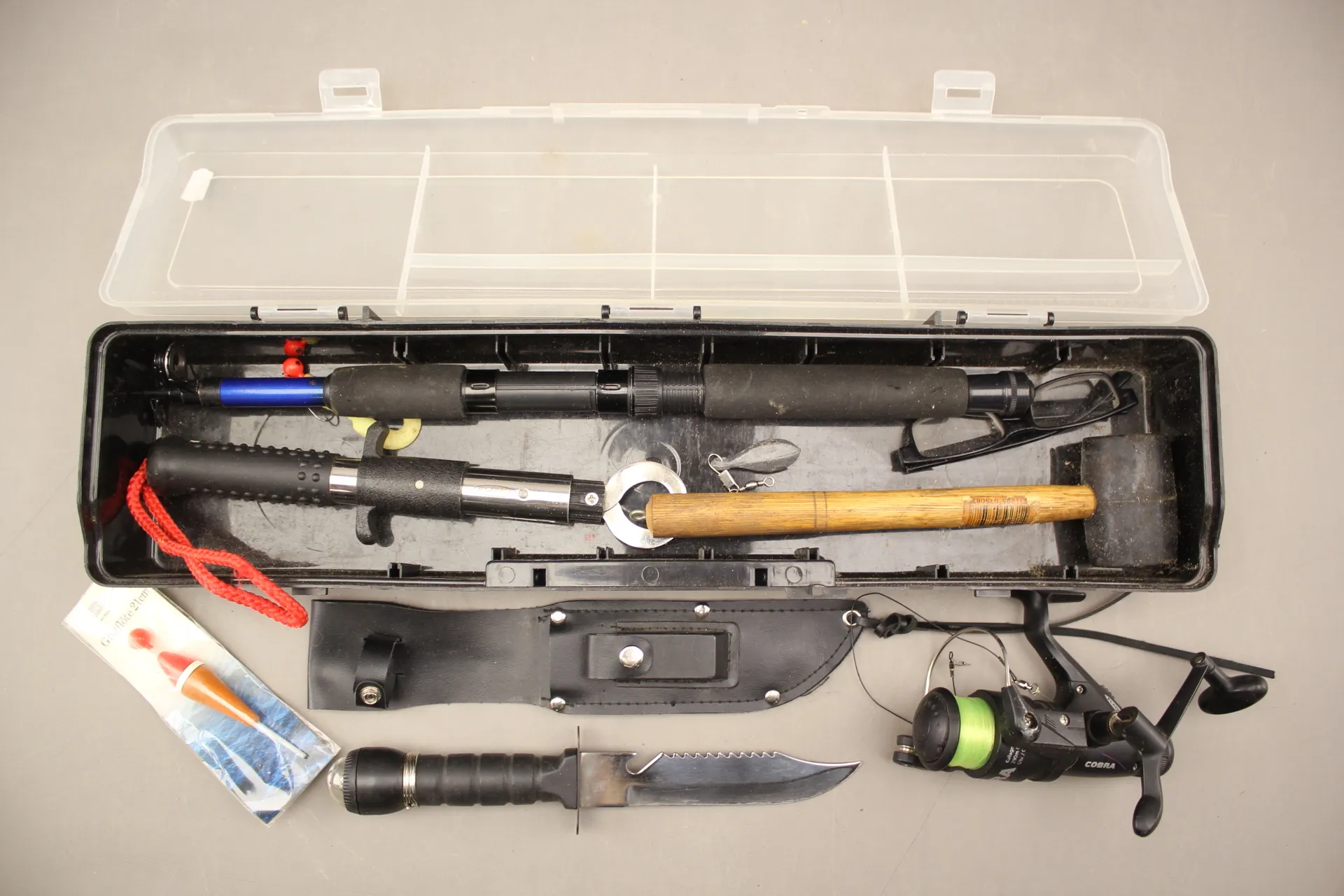 258. Fiskespö, rulle, kniv, mm bla Fladen