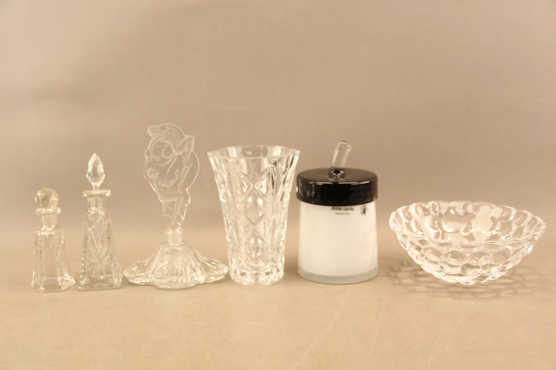 551. Flakonger 3 st, vas, lockskål och skål Orrefors "Hallon", mm bla Maria Vinka
