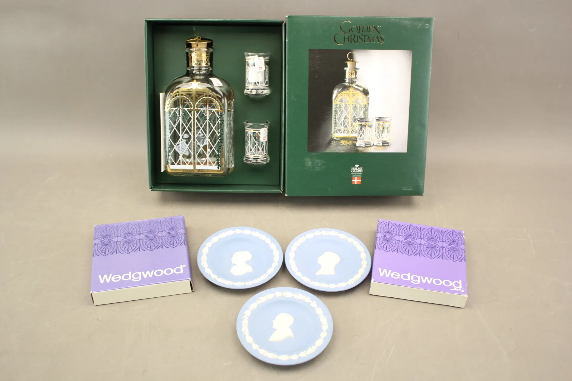 337. Flaska, snapsglas 2 st Holmegaard och småfat Wedgwood 3 st