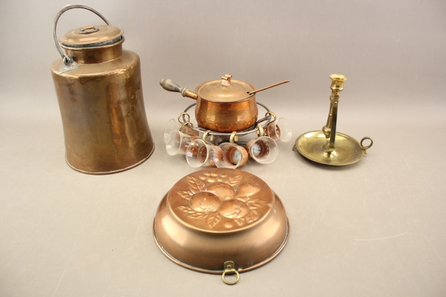 174. Glöggset, mjölkflaska, ljusstake mm i bla koppar