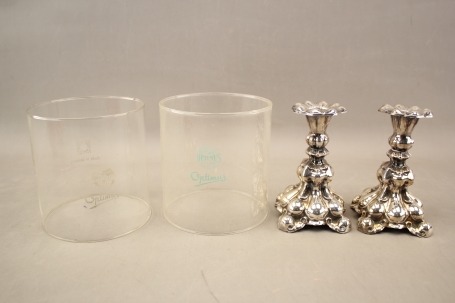 369. Glas till stormlyktor 2 st och ljusstakar barockmodell 1 par
