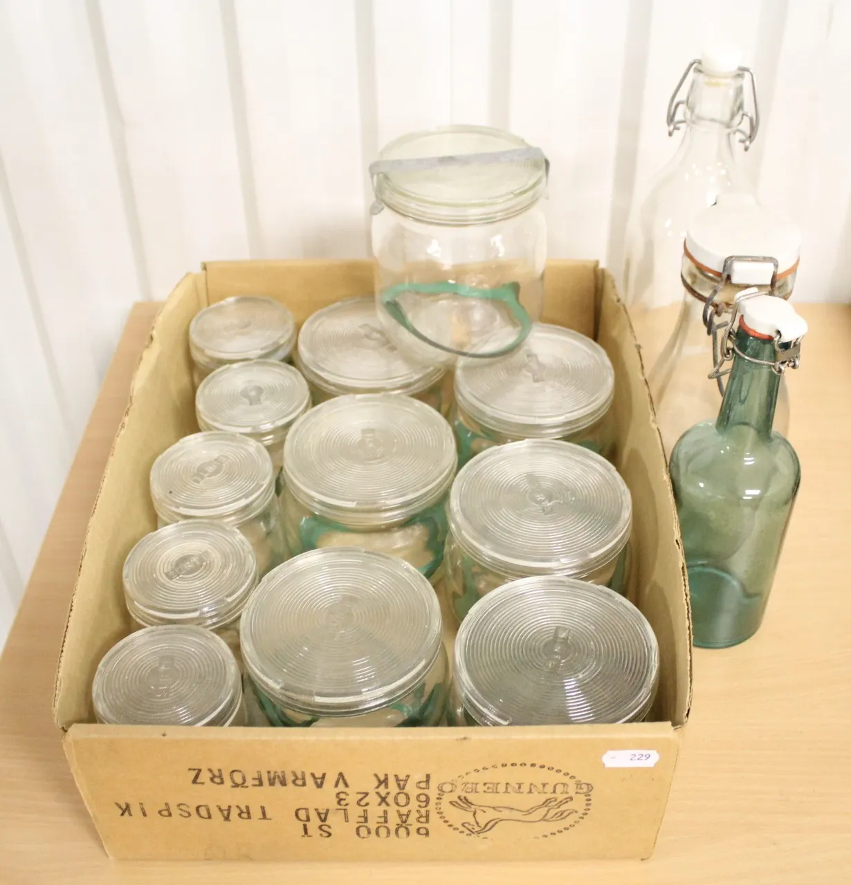 229. Glasflaskor 3 st och burkar