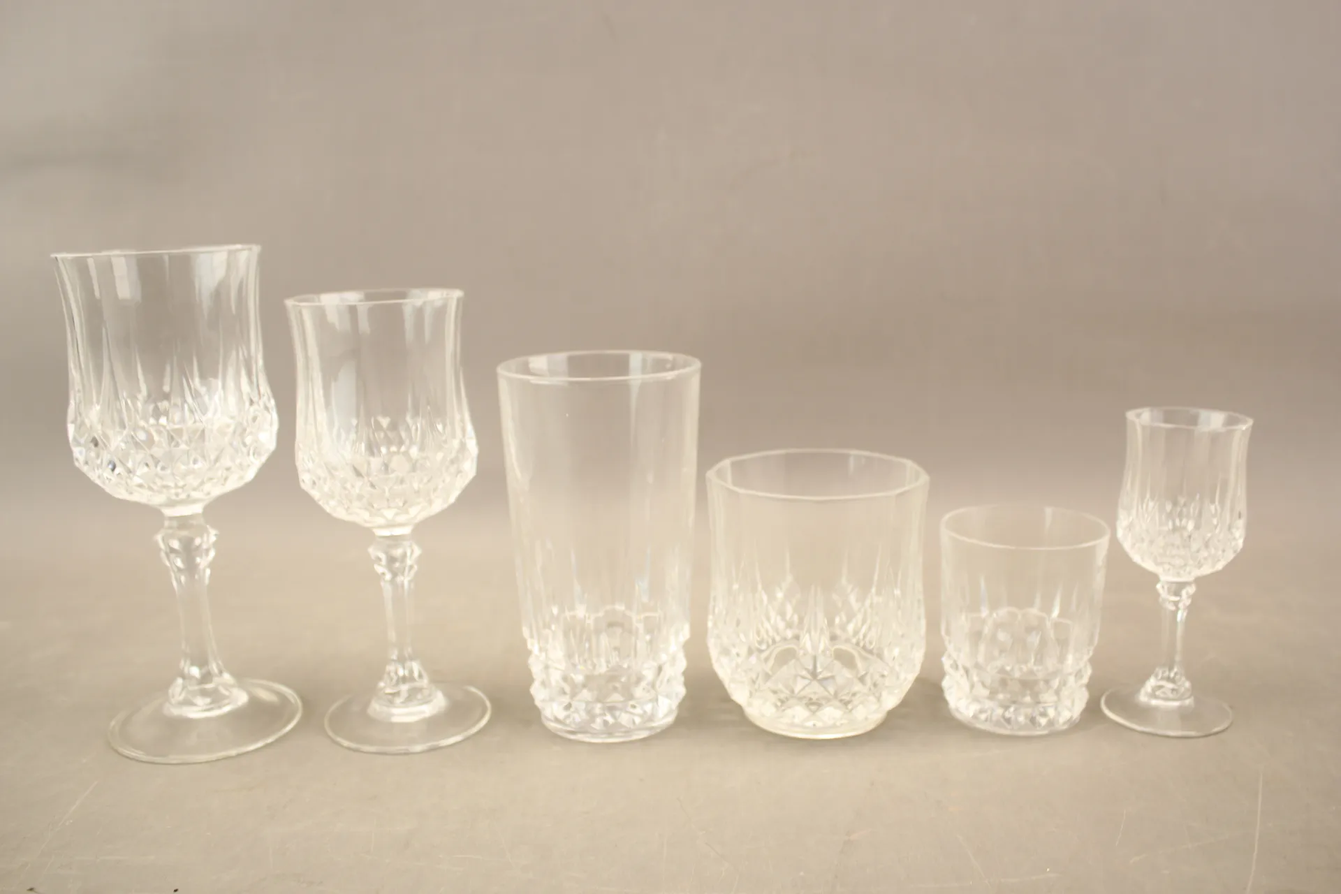 Rödvinsglas 11 st, vitvinsglas 12 st, snapsglas 11 st, whiskyglas 12 st, grogglas 10 st, selterglas 12 st