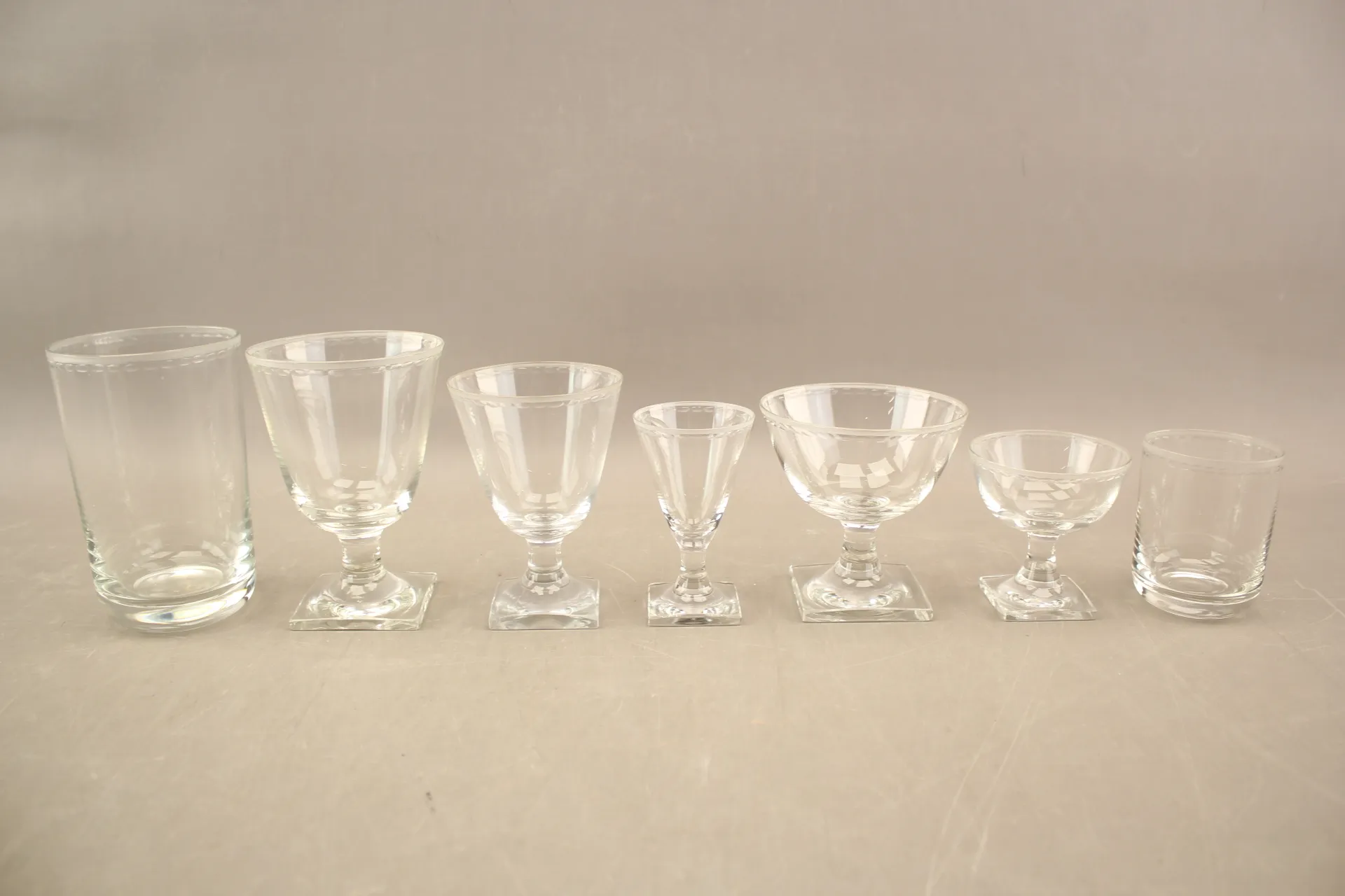 Grogglas 6 st, ölglas 15 st, vitvinsglas 16 st, rödvinsglas 15 st, snapsglas 13 st, selterglas 15 st, likörglas 15 st