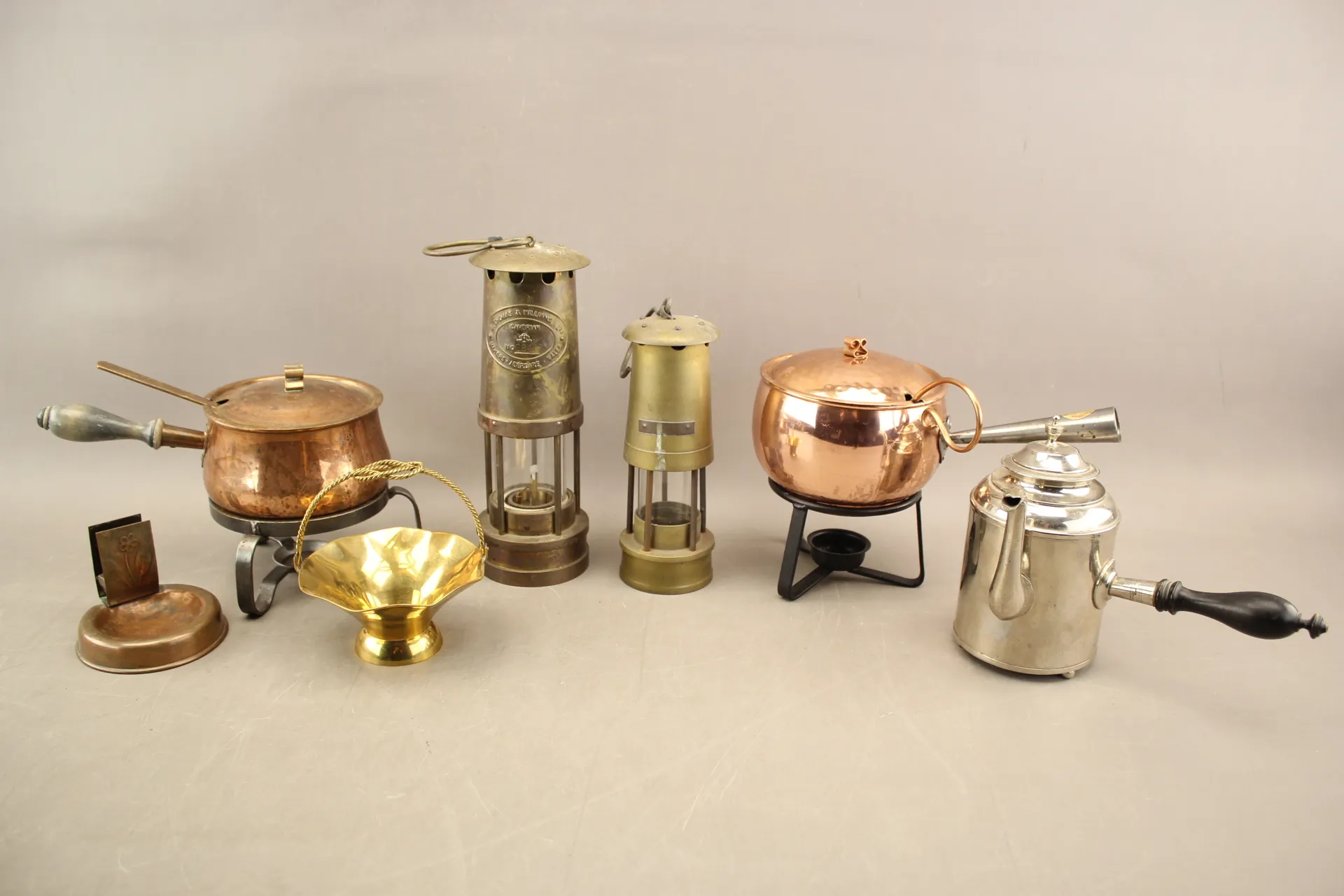 361. Gruvlyktor 2 st, kannor, skål, mm bla Thomas & Williams Ltd Wales