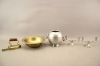 128. Hänkelvas i tenn GAB, ljusstakar 1 par, skål och strykjärn
