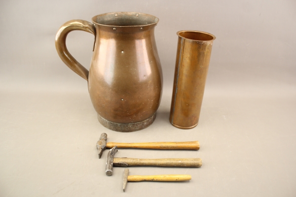 156. Hammare 3 st, kanna 10L och vas i bla koppar