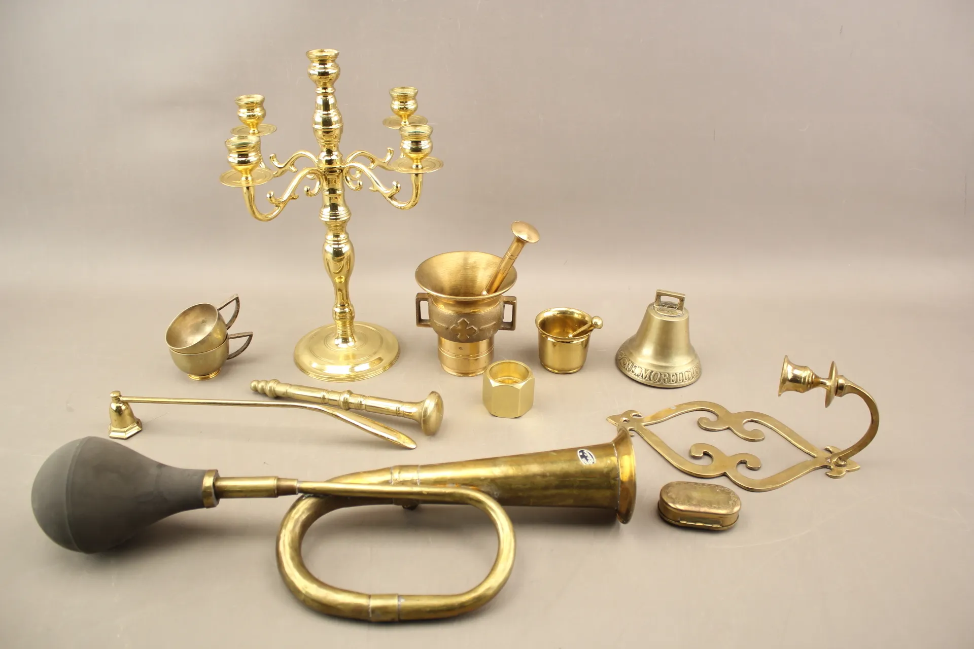 377. Horn, kandelaber, mortlar, mm i mässing