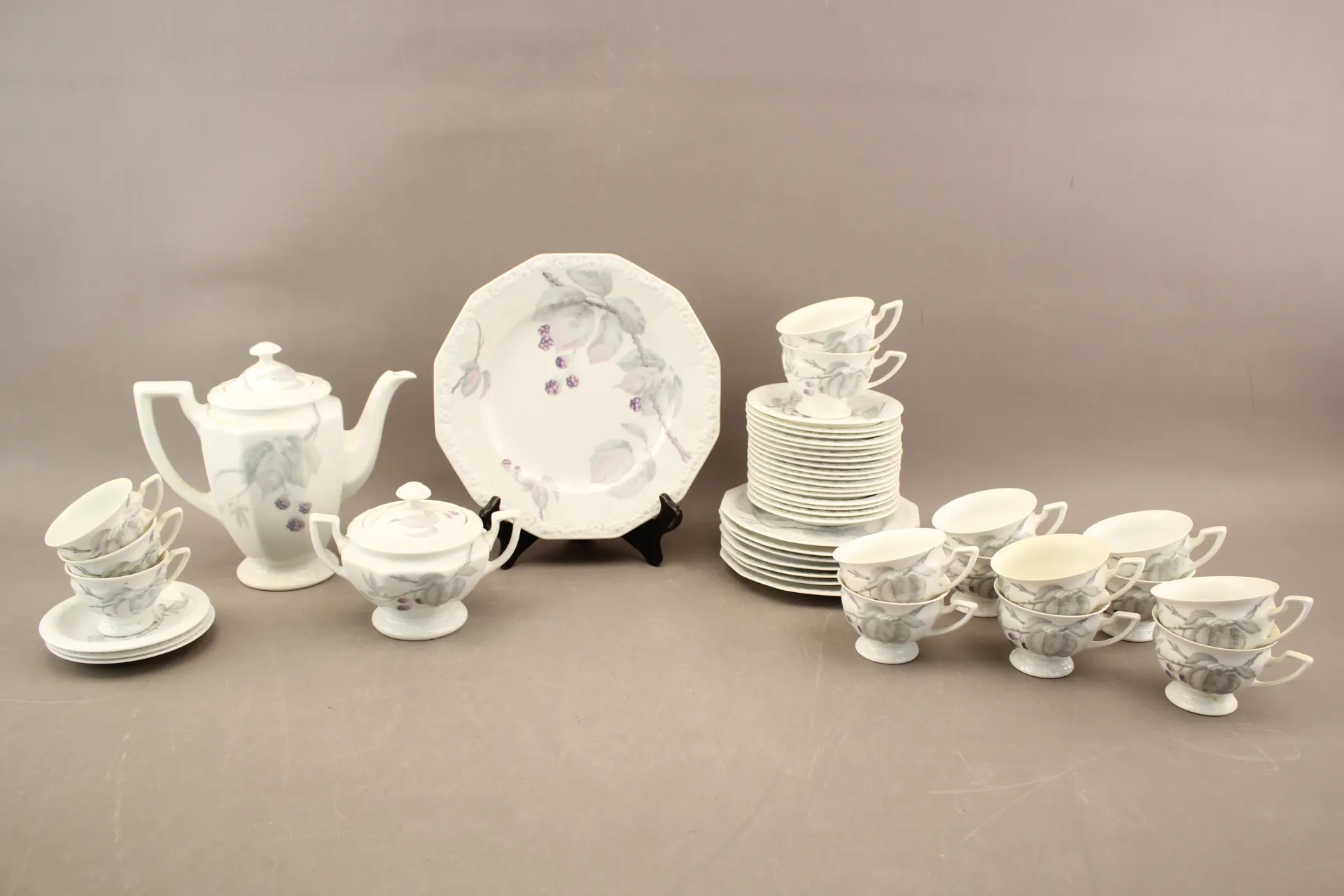 Moccakoppar 3 st, moccafat 3 st, kaffekoppar 12 st, kaffefat 17 st, assietter 7 st, fat, kanna, sockerskål