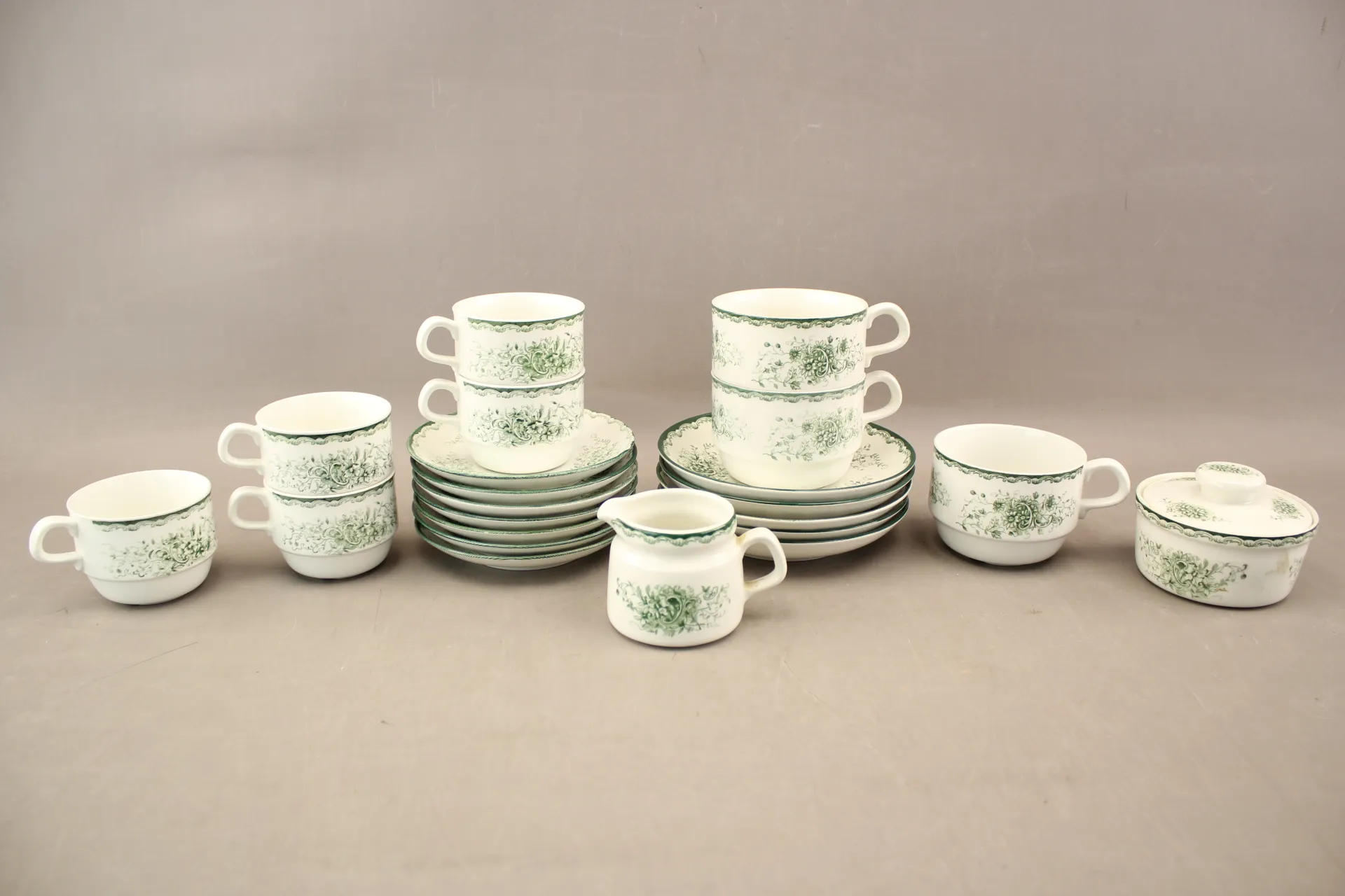 Tekoppar 3 st, tefat 5 st, kaffekoppar 5 st, kaffefat 7 st, gräddkanna och sockerskål (naggad)