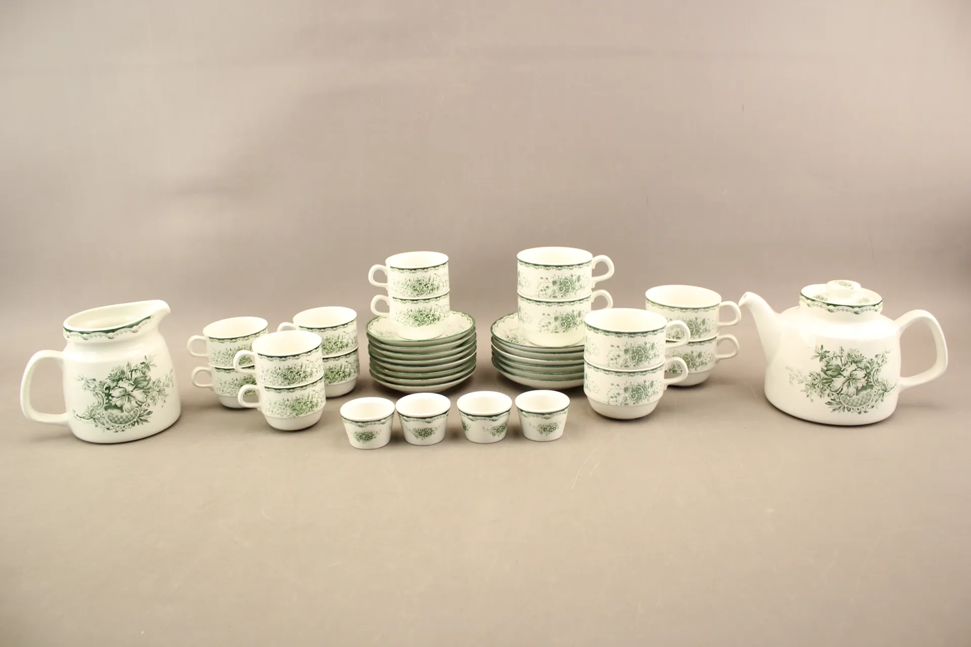 Tekoppar 6 st, tefat 6 st, kaffekoppar 8 st, kaffefat 8 st, äggkoppar 4 st, kanna och kaffekanna