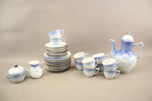 Koppar 10 st, fat 10 st, assietter 12 st , kaffekanna, gräddkanna och sockerskål