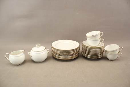 Kaffekoppar 4 st, kaffefat 11 st, assietter 11 st, sockerskål och gräddkanna