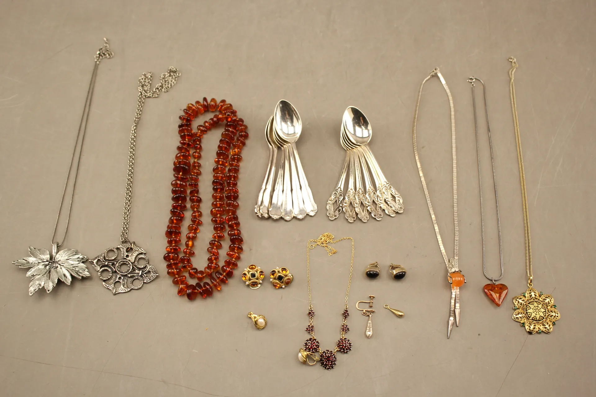 204. Kaffeskedar i nysilver och diverse smycken i bla bärnsten