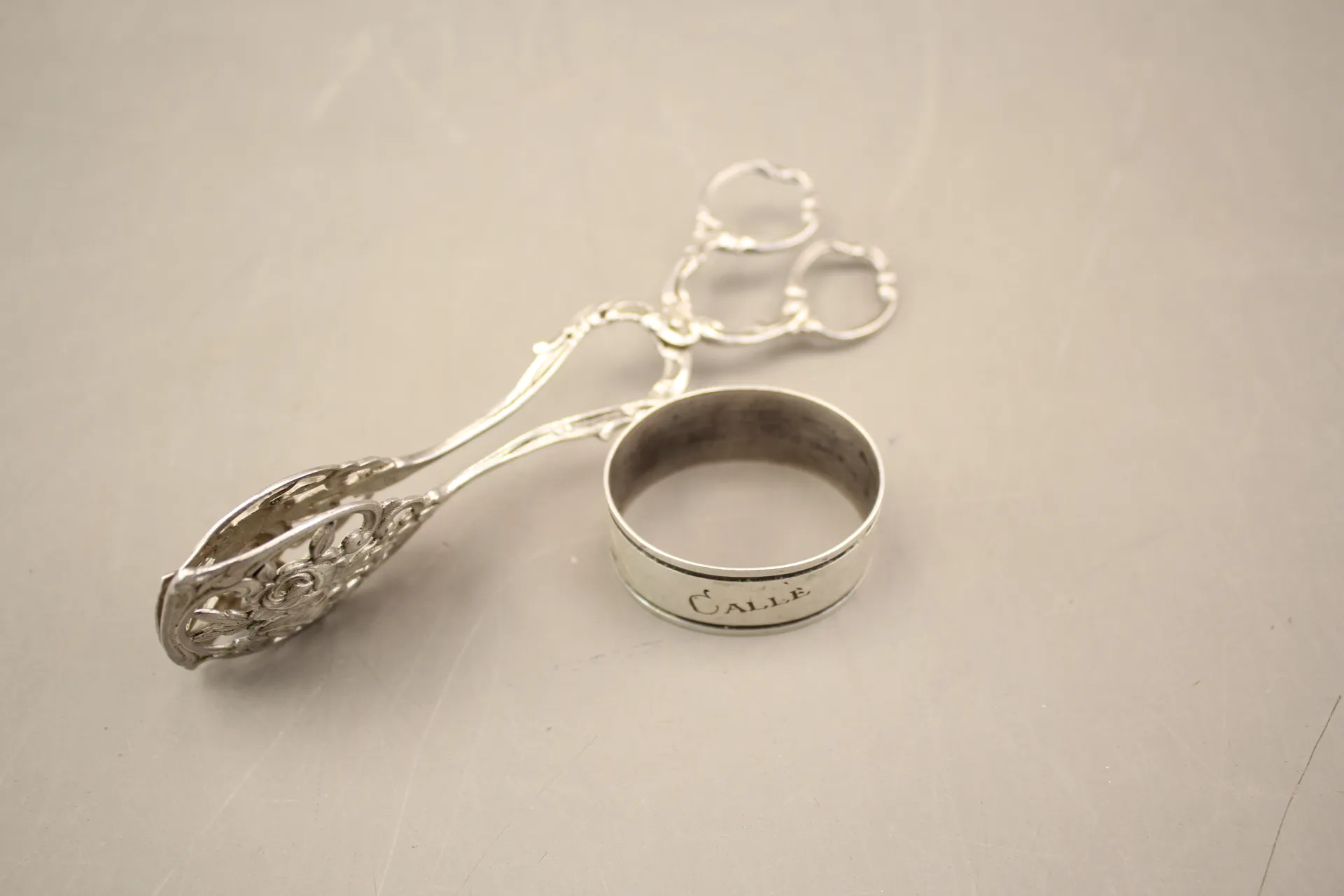 273. Kaktång och servettring i silver