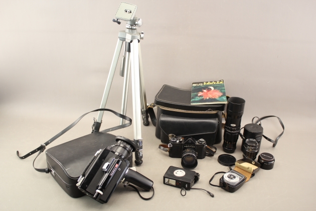 345. Kamera Pentax med tillbehör, stativ och filmkamera