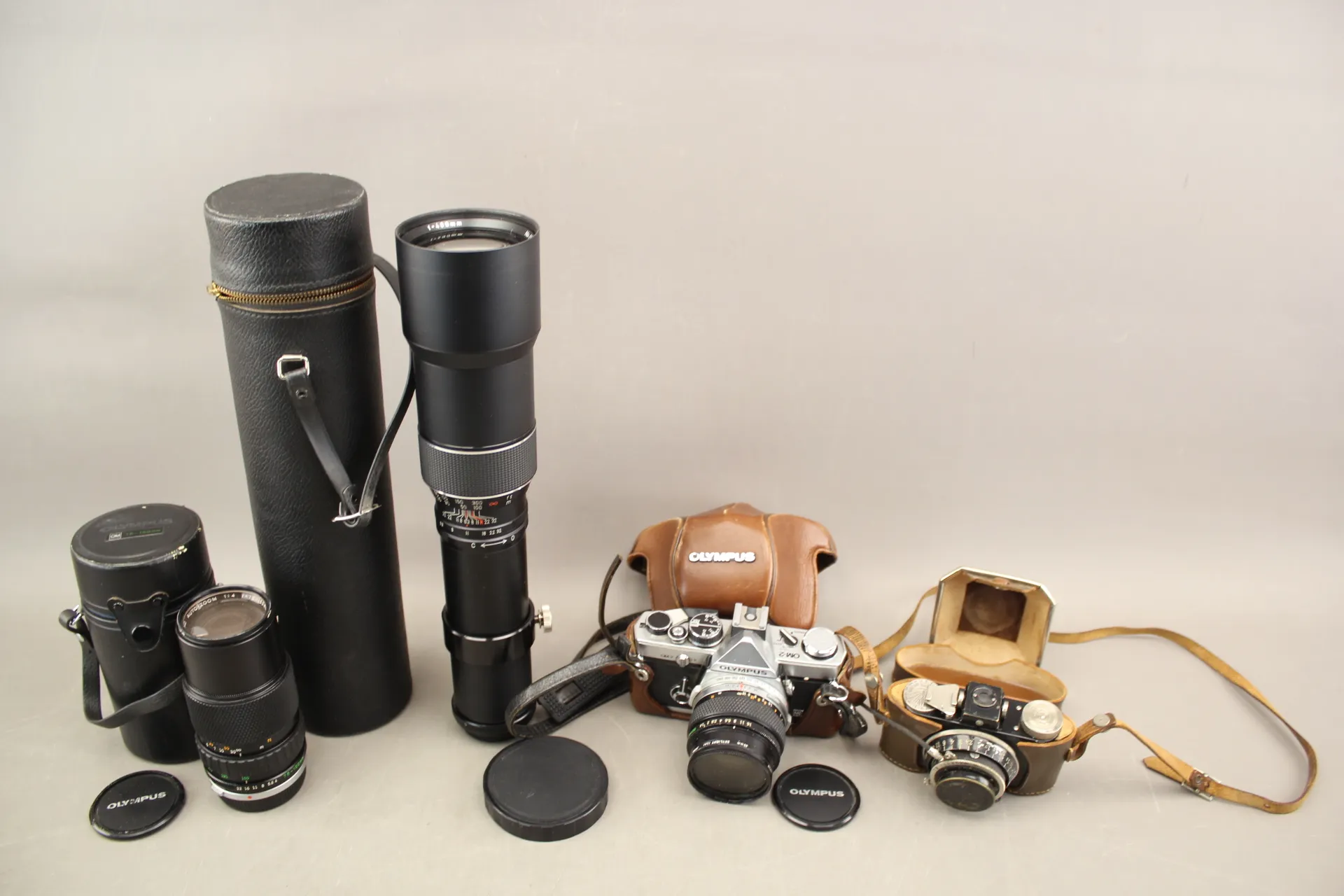 166. Kameror 2 st Olympus OM-2, Pupille och objektiv 2 st