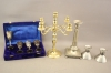 87. Kandelaber i mässing, tennljusstakar 3 st och glas i nysilver 4 st