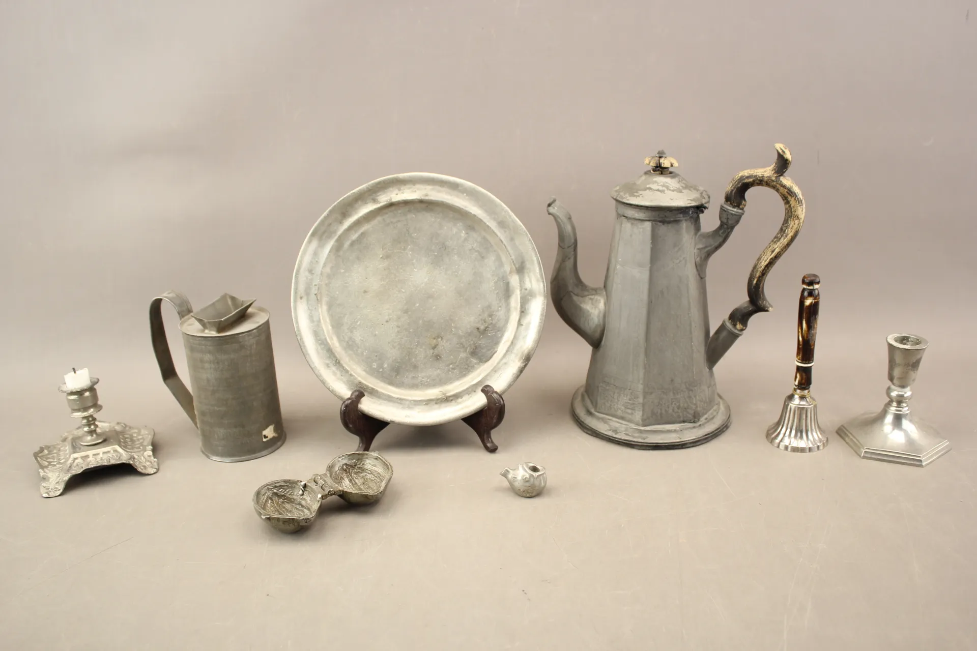 94. Kanna, sparbössa, ljusstakar mm i bla tenn
