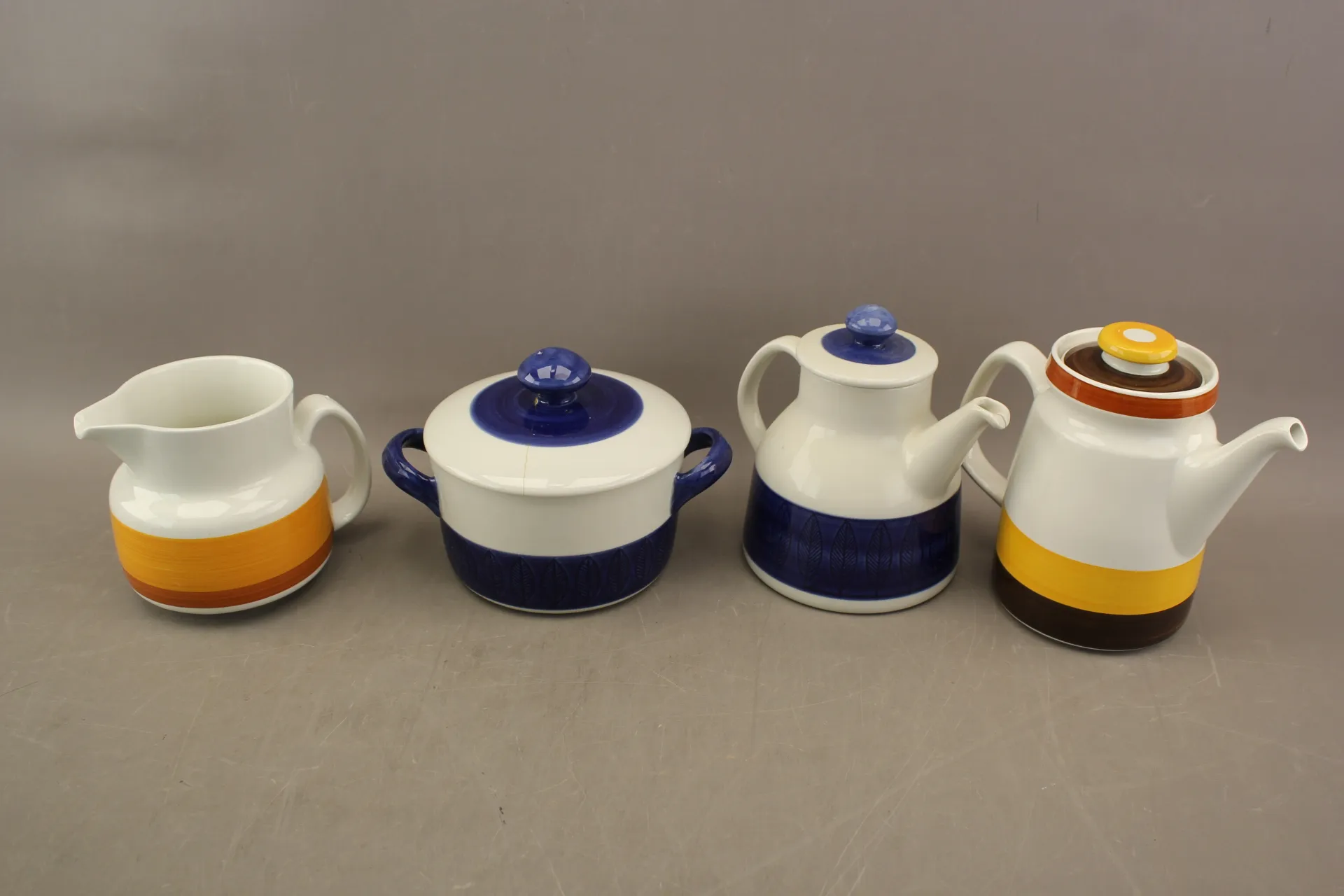 379. Kannor 3 st och terrin Gefle "Stina" och Rörstrand "Koka" Hertha Bengtson