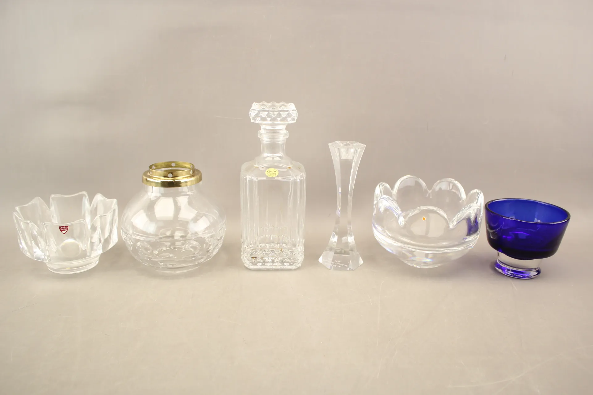 90. Karaff Frankrike, skålar 3 st, vas och ljusstake bla Orrefors