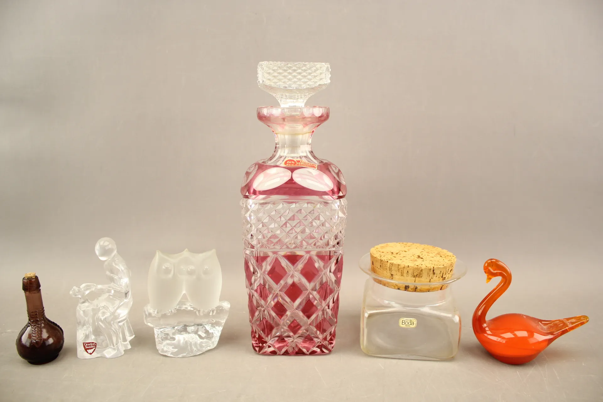 149. Karaffer 2 st, glaskonst 3 st och burk med lock bla Orrefors Olle Alberius och Boda