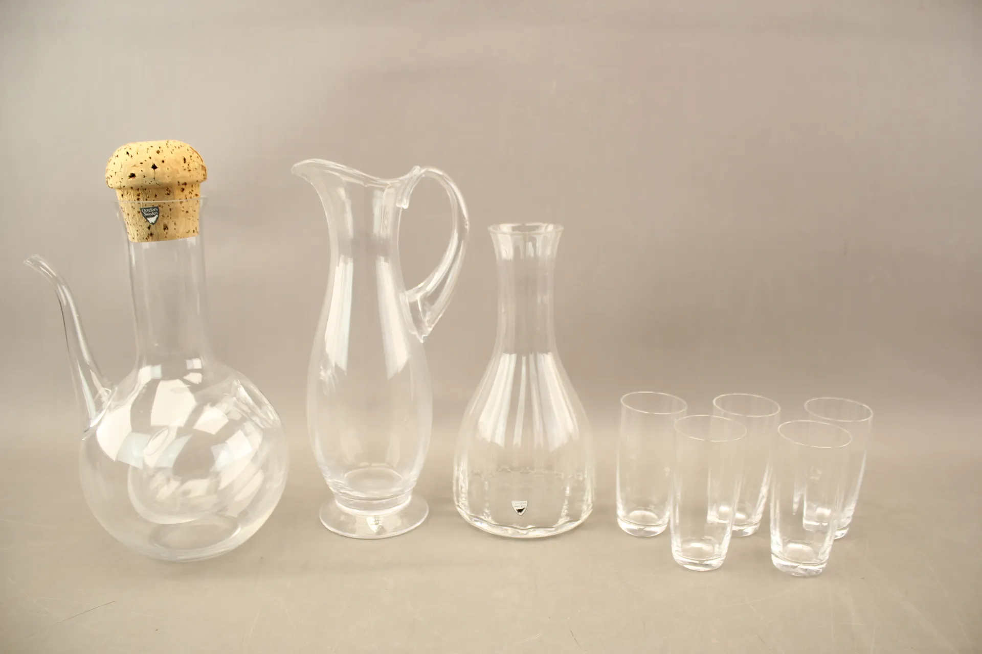 206. Karaffer 2 st, kanna och glas 5 st bla Orrefors
