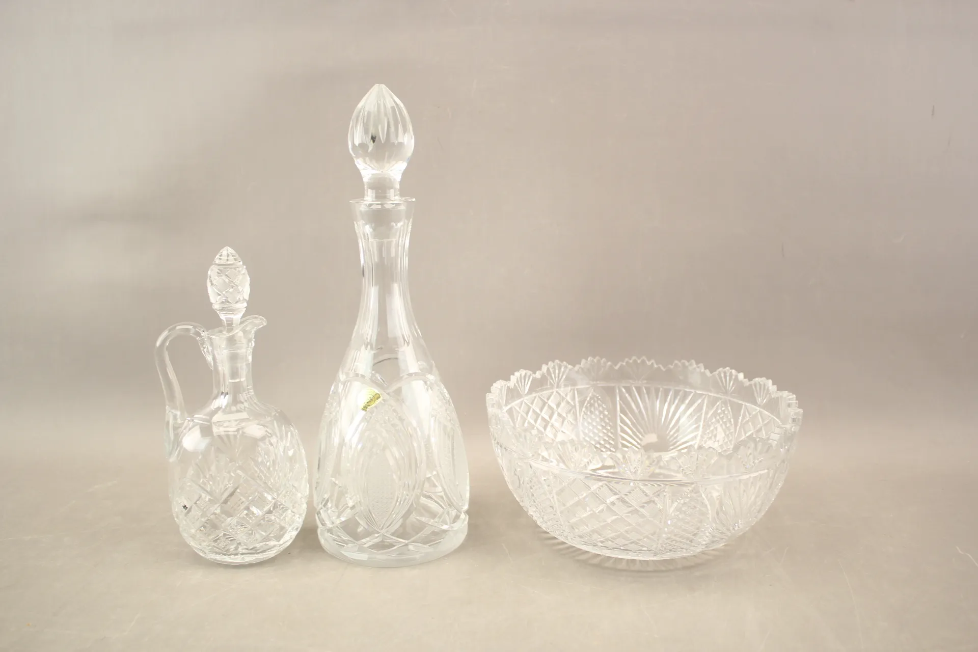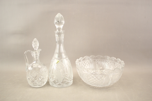 128. Karaffer 2 st och skål i kristall
