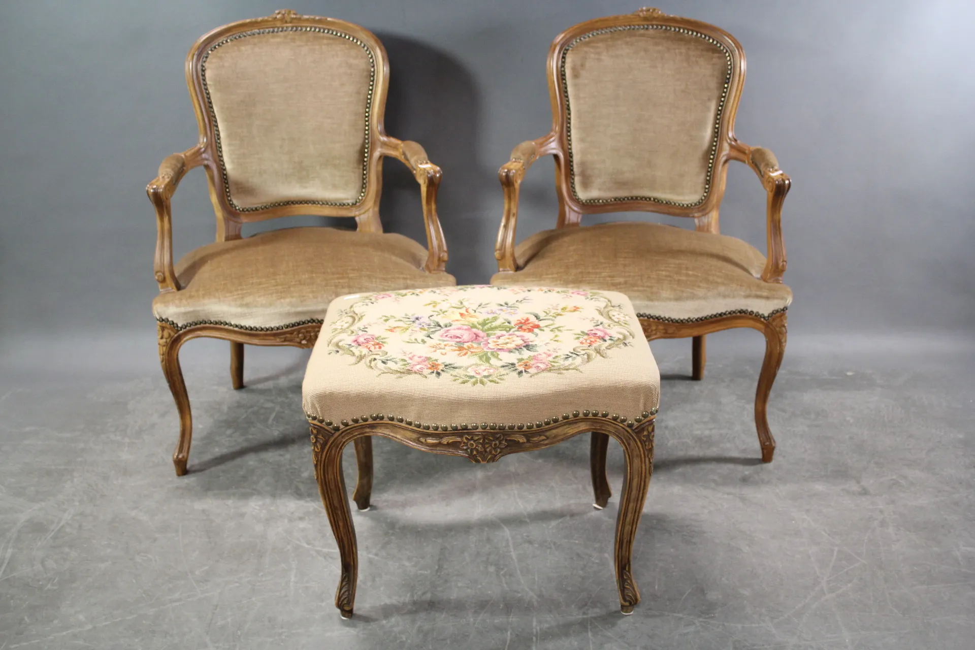 363. Karmstolar i rokokostil 2 st och pall med broderad sits
