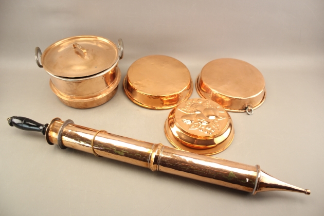 375. Kastrull, brandspruta och formar 3 st i koppar