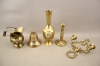 401. Klocka G Laxgård, väggljusstake, ljusstake, kolhämtare och vas i mässing