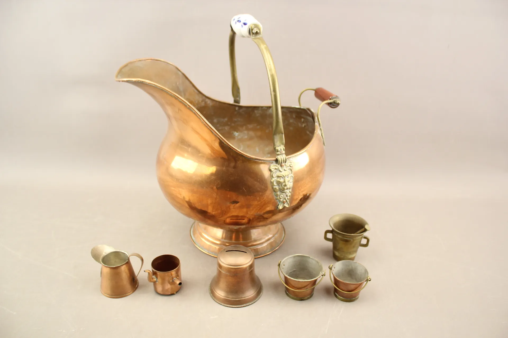 421. Kolhämtare i koppar, mortel, kanna, mm