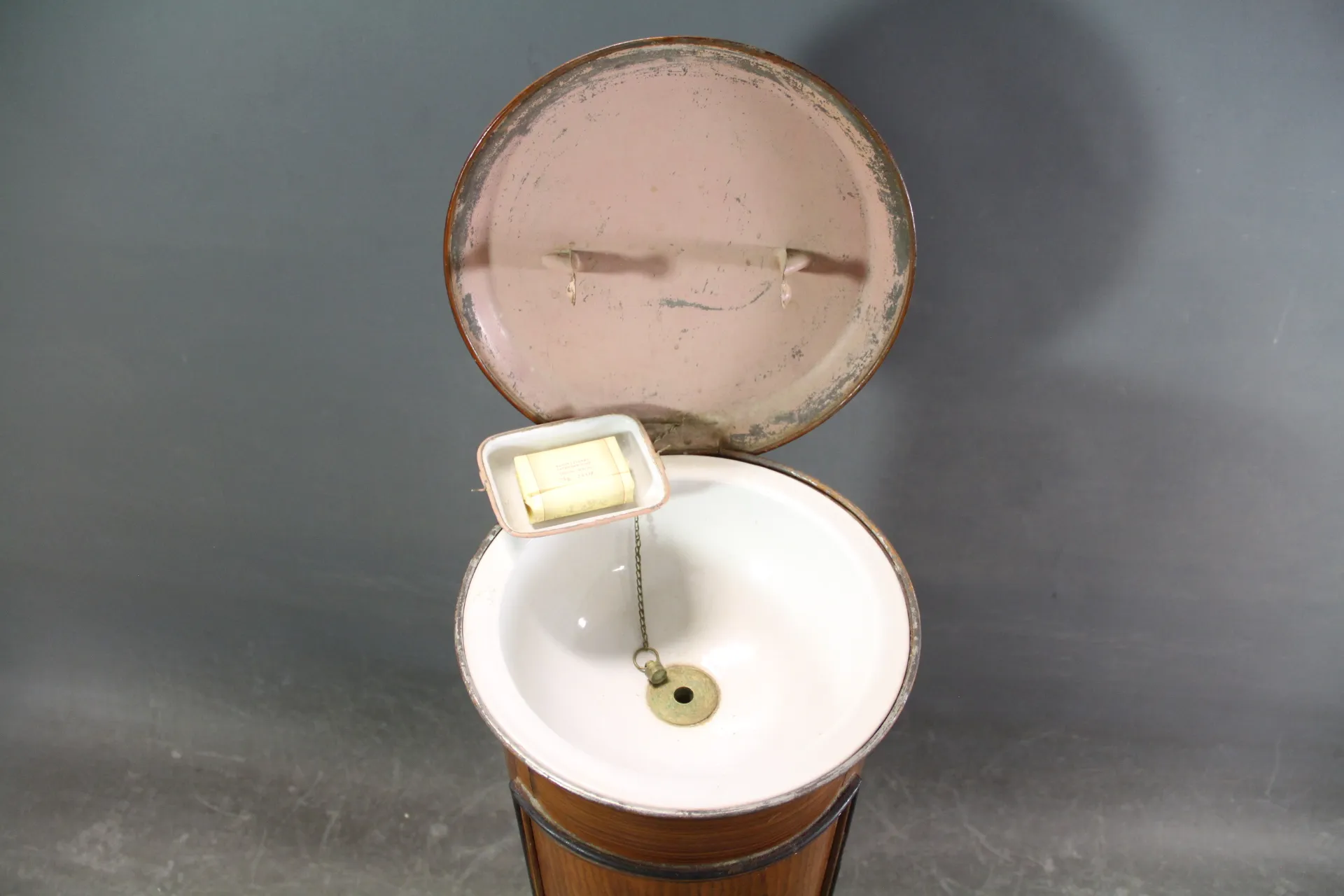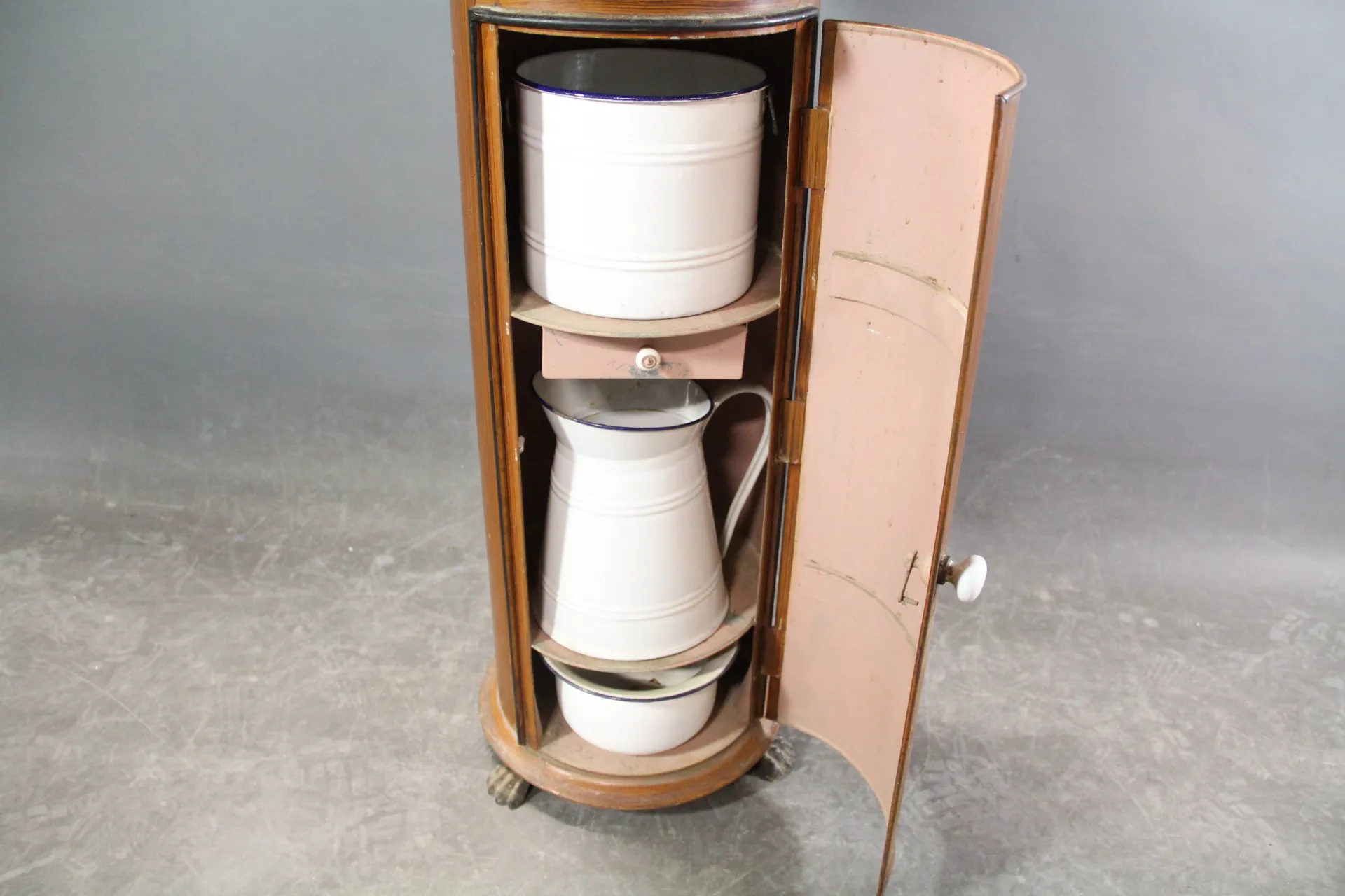 288. Kolonn/tvättskåp, bemålad metall, med emaljföremål