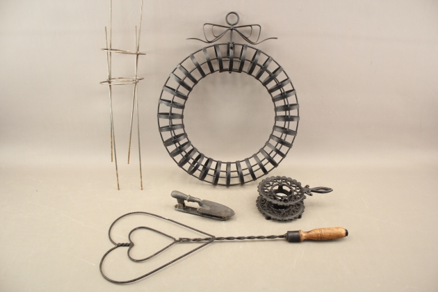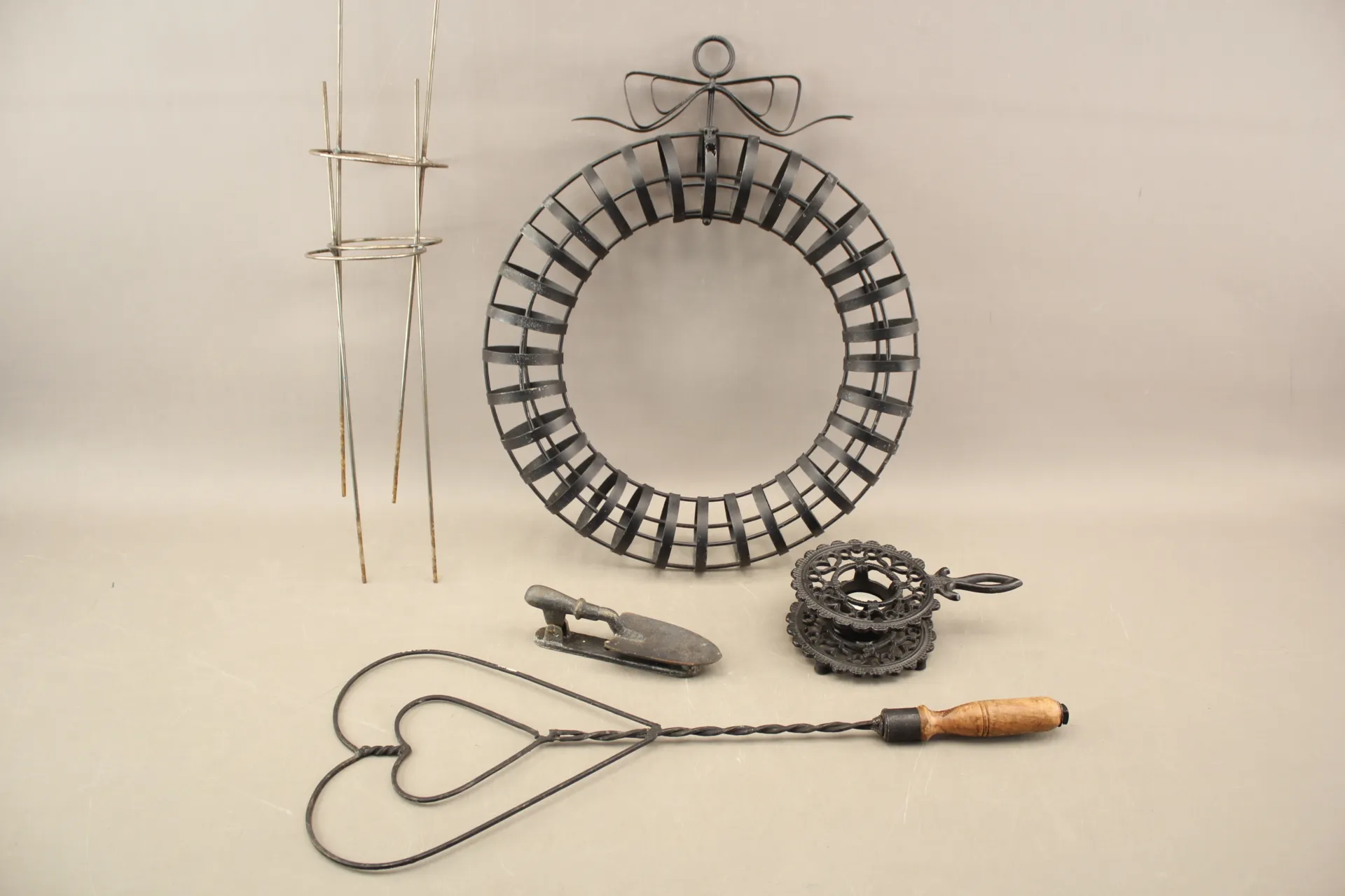 390. Krans i metall, ljusstake, dörrknackare i gjutjärn, mm