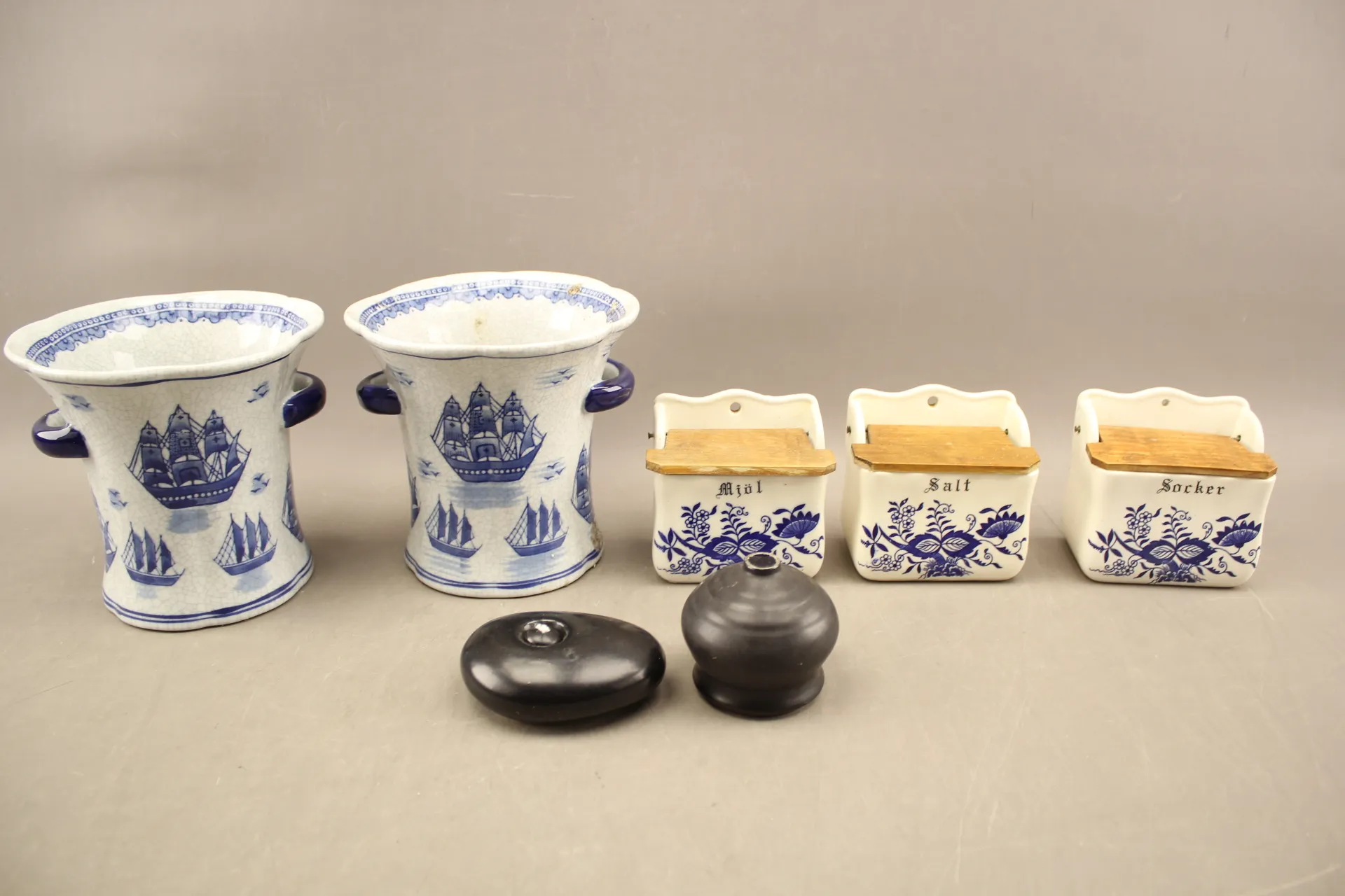 136. Krukor Göteborg 1 par, skeppor i porslin 3 st mm
