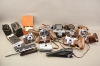 513. Låda med diverse äldre kameror och tillbehör