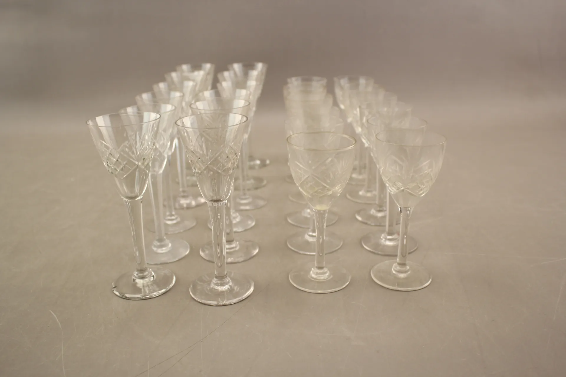 11. Likörglas 12 st och snapsglas 12 st i kristall med helgaslipning 1900-tal