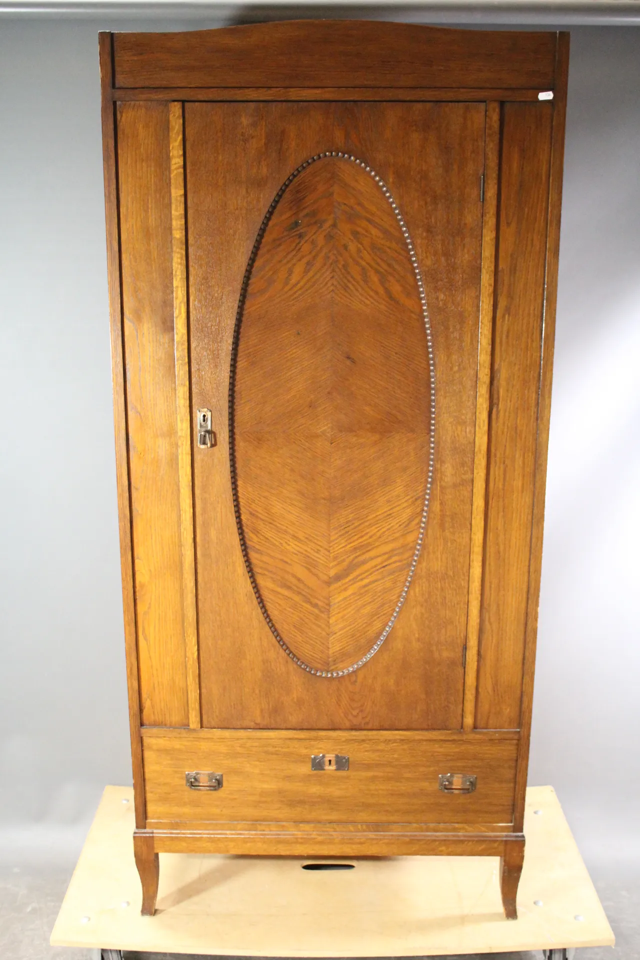 H: 186 cm, 84 x 47 cm, nyckel saknas, skåpet låst, bakstycke löst