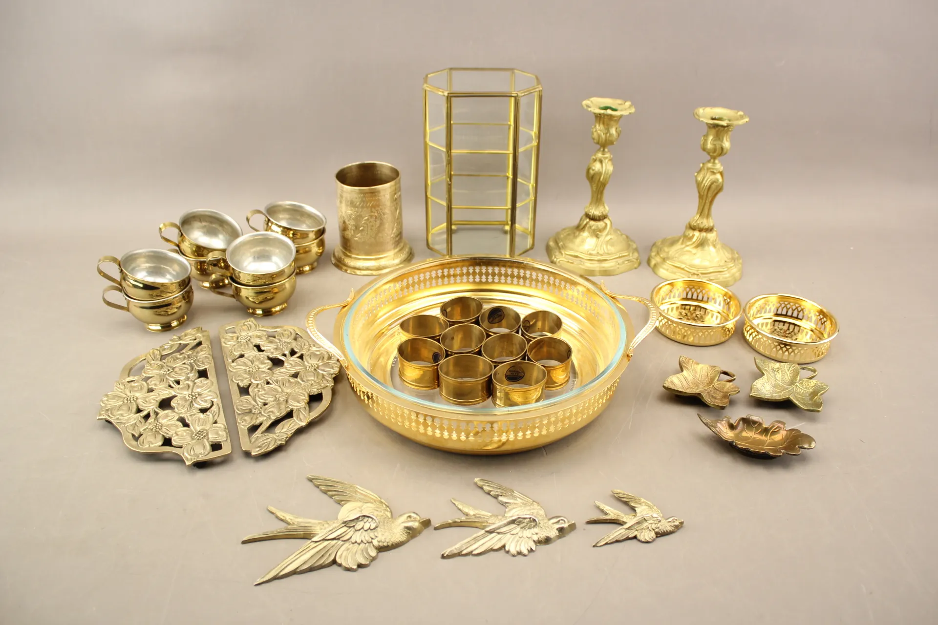 309. Ljusstakar 1 par, koppar, servettringar mm i bla mässing