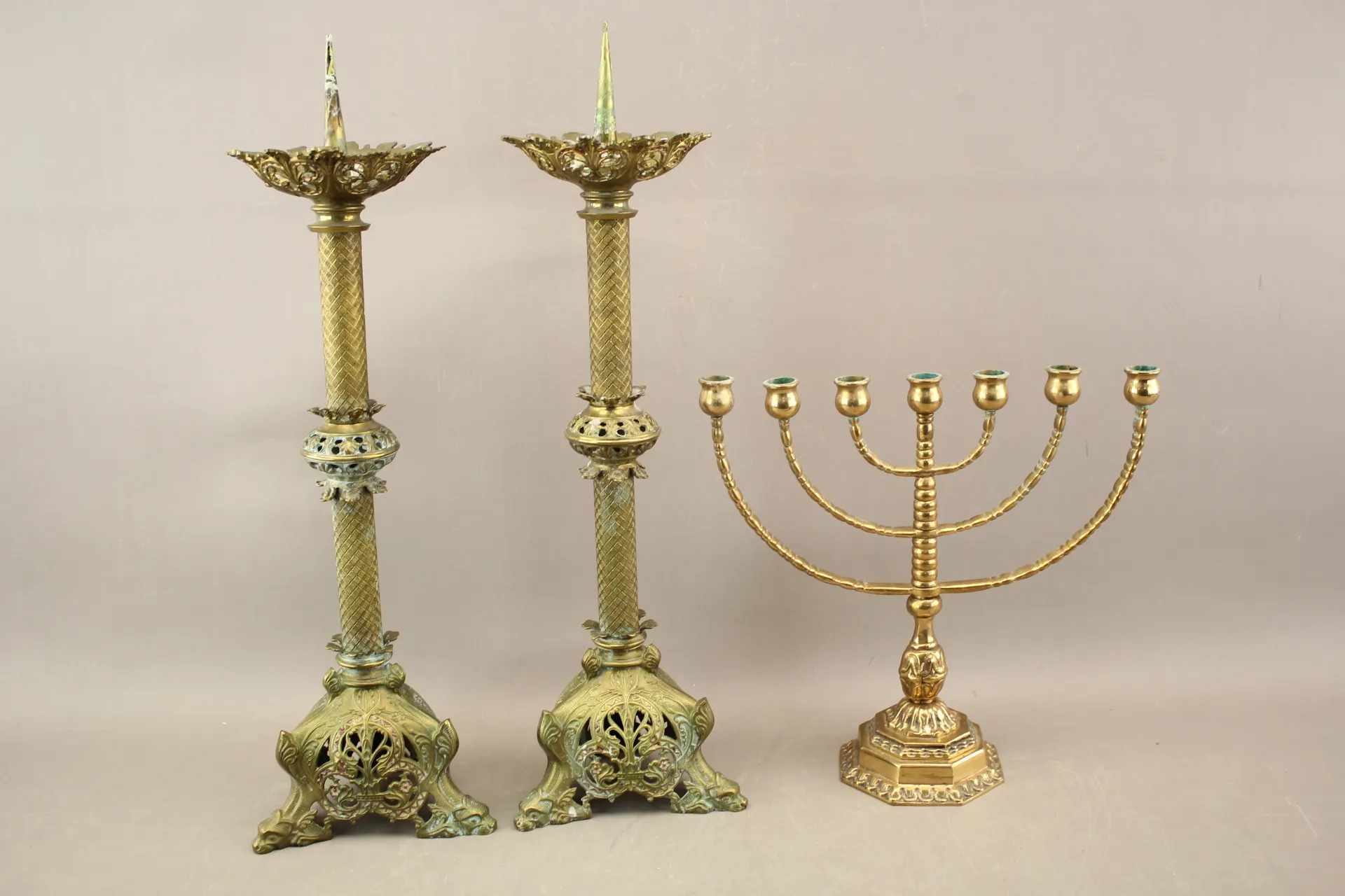 378. Ljusstakar 1 par och menorastake i bla mässing