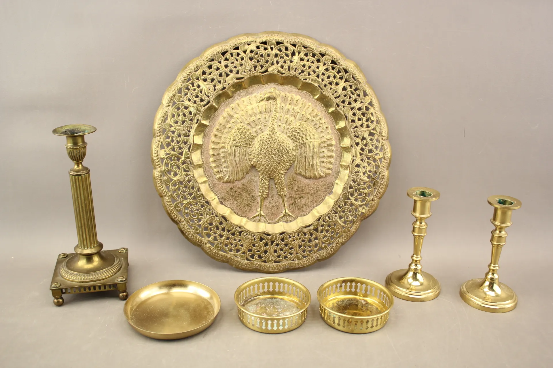 377. Ljusstakar 3 st, väggdekoration mm i bla mässing