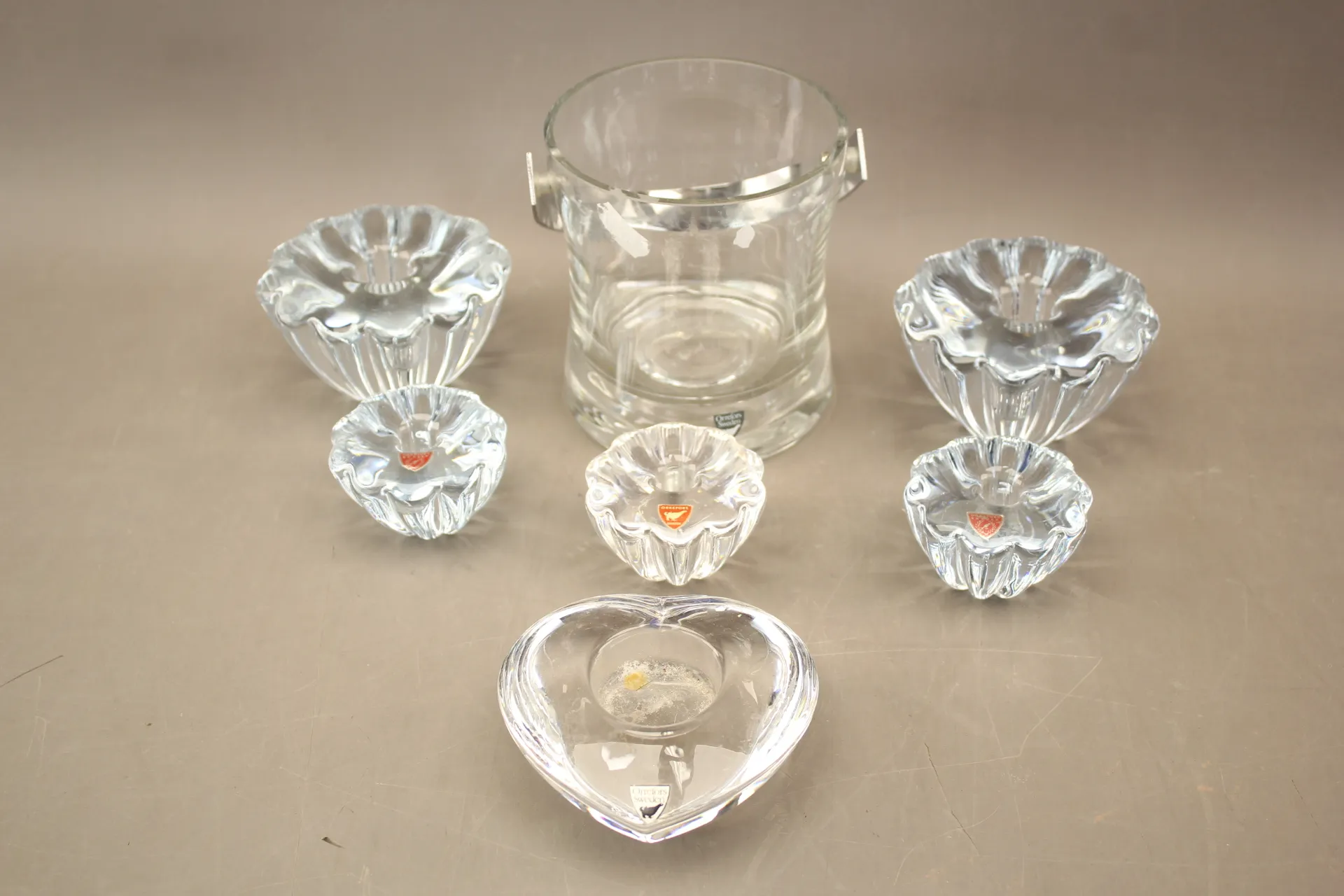 396. Ljusstakar 5 st, ljuslykta och ishink Orrefors