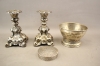 160. Ljusstakar barockmodell 1 par, burk med lock och skål i nysilver