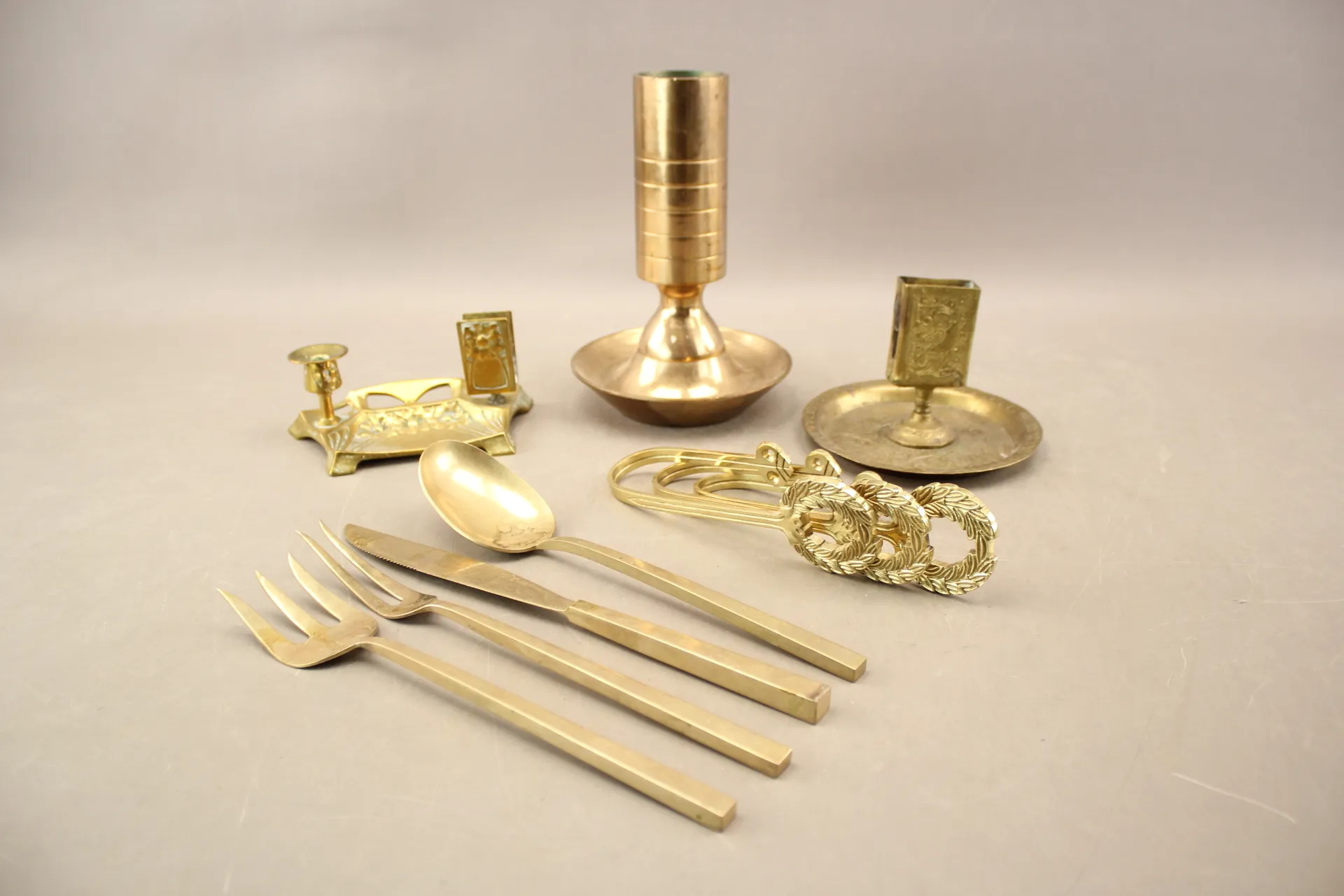 229. Ljusstake, tändstickshållare, bestick mm i mässing