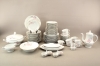 Mattallrikar 12 st, halvtallrikar 10 st, djupa tallrikar 12 st, assietter 12 st, uppläggningsfat 3 st, skål, terrin, såskanna, kryddskålar 2 st, kaffekoppar 9 st, kaffefat 12 st, kaffekanna och gräddkanna