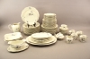 Mattallrikar 12 st, halvtallrikar, 12 st, assietter 11 st, djupa tallrikar 12 st, uppläggningsfat 6 st, skålar 2 st, såsskål, kanna, kaffekoppar 9 st, kaffefat 12 st, sockerskål och gräddkanna