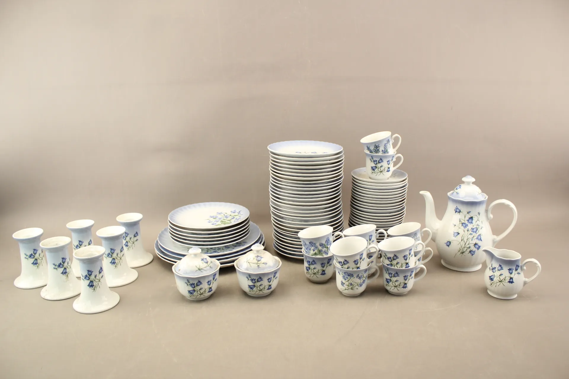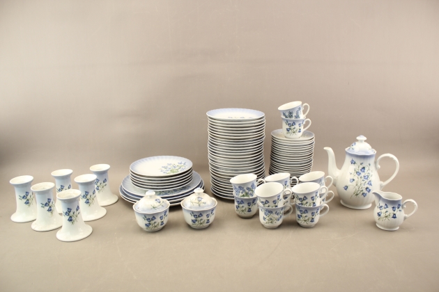 Kaffekoppar 12 st, kaffefat 25 st, assietter 29 st, sockerskålar 2 st, gräddkanna, ljusstakar 6 st, kaffekanna, mattallrikar 2 + 2 st, halvtallrikar 6 st, dekoren skiljer sig åt