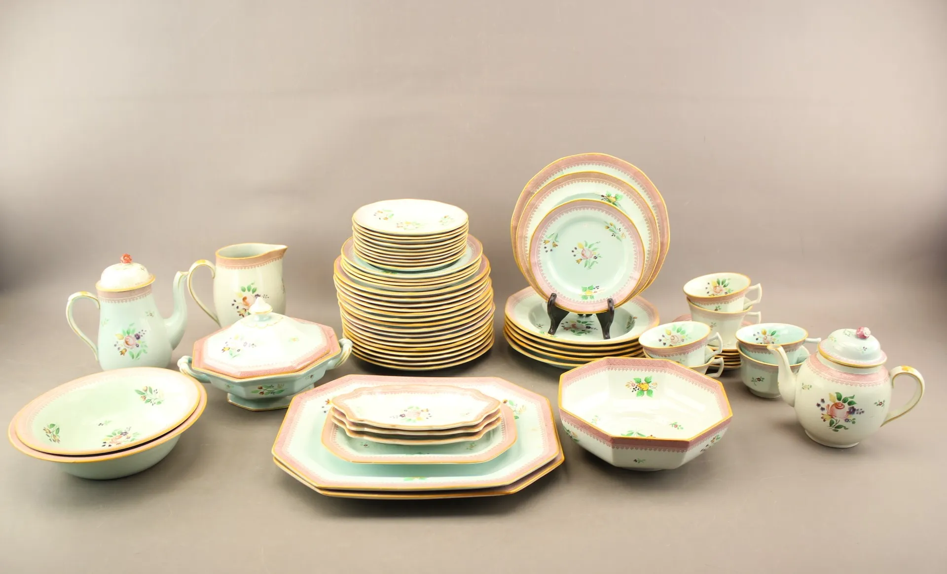 Mattallrikar 17 st, halvtallrikar 5 st, assietter 11 st, djupa tallrikar 5 st, uppläggningsfat 6 st, skålar 3 st, kanna, terrin, tekoppar 6 st, tefat 6 st, kaffekanna och tekanna