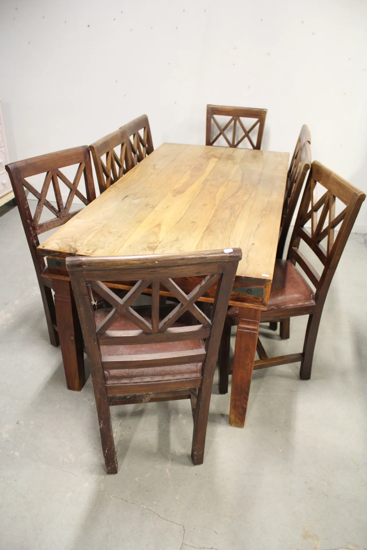Bordet H: 76,5 cm, 180 x 90 cm, iläggsskivor 2 st om 50 cm, blekt skiva, smutsiga/slitage, ena iläggsskivan är stagen lösa