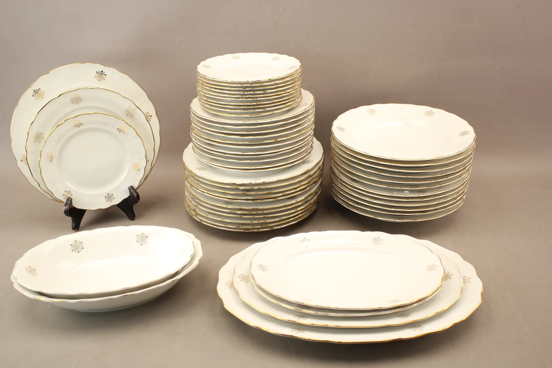 Mattallrikar 11 st, halvtallrikar 12 st, assietter 11 st, djupa tallrikar 12 st, uppläggningsfat 4 st och skålar 2 st